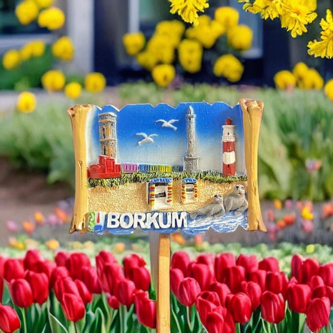 Schöner Borkum Magnet mit vielen Wahrzeichen der Insel - als Papyrusrolle.